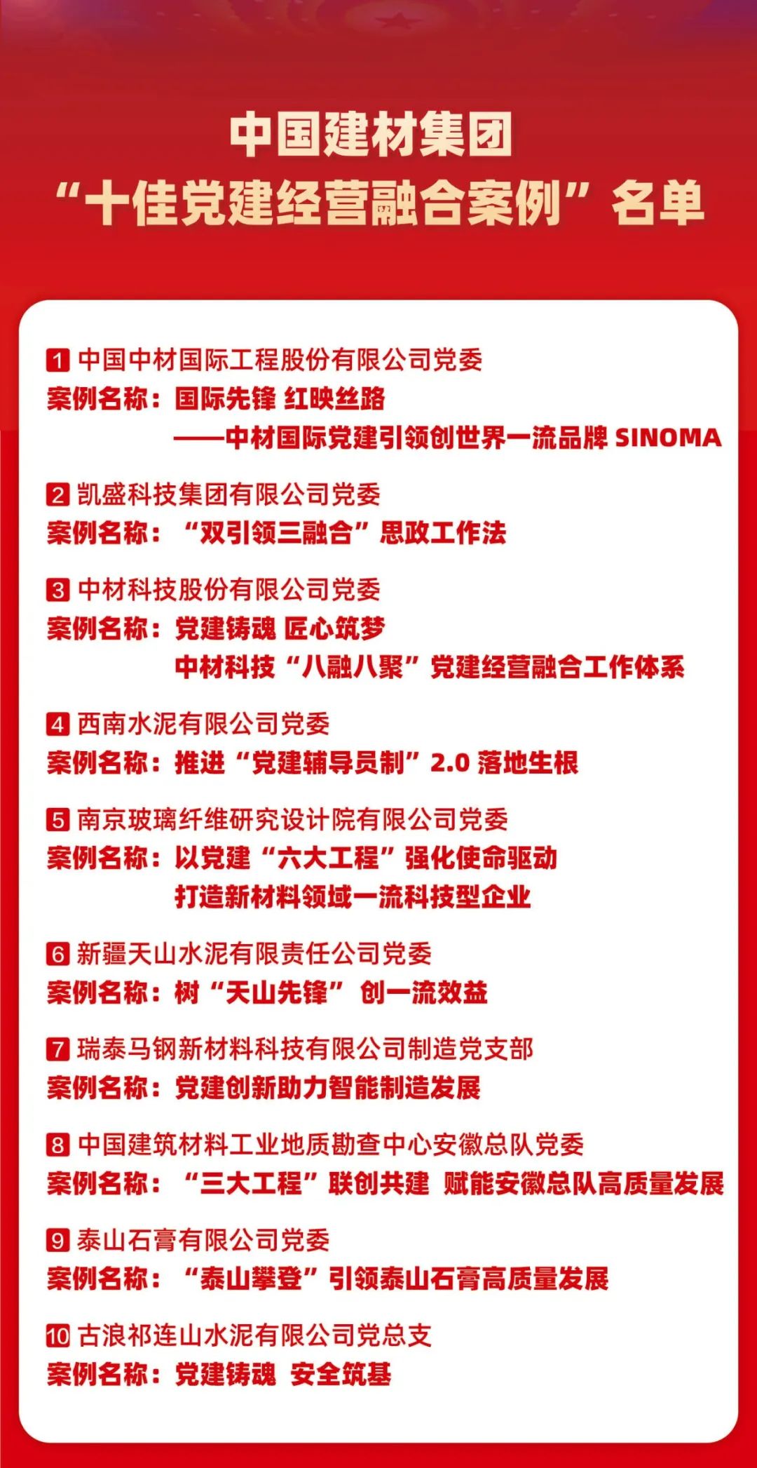 会上,发布了集团党建经营融合“十佳案例”“优秀案例”,展播了凯盛科技、泰山石膏、瑞泰马钢案例视频,中材国际、中材科技、古浪祁连山等三家获奖企业代表作经验交流。